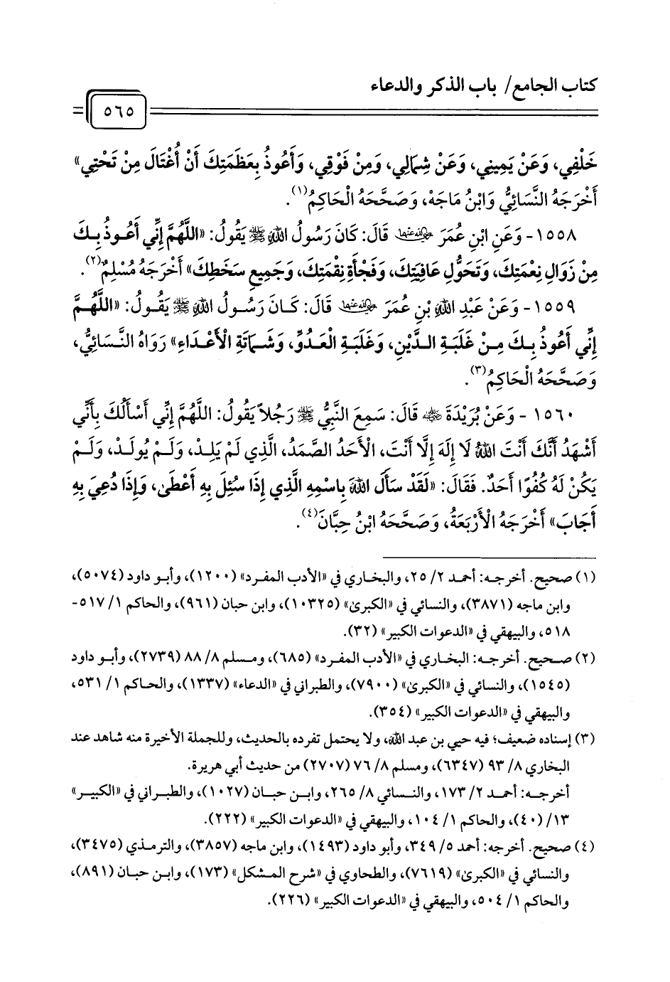 1558 - وَعَنِ ابْنِ عُمَرَ رَضِيَ اللَّهُ عَنْهُمَا قَالَ: كَانَ رَسُولُ اللَّهِ - صلى الله عليه وسلم - يَقُولُ: «اللَّهُمَّ إِنِّي أَعُوذُ بِكَ مِنْ زَوَالِ نِعْمَتِكَ، وَتَحَوُّلِ عَافِيَتِكَ، وَفَجْأَةِ نِقْمَتِكَ، وَجَمِيعِ سَخَطِكَ» أَخْرَجَهُ مُسْلِمٌ (¬1).