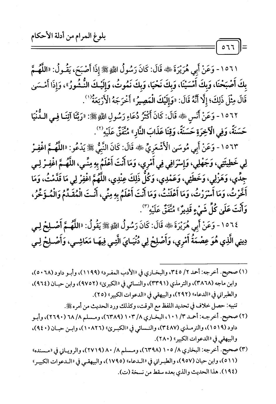 1561 - وَعَنْ أَبِي هُرَيْرَةَ - رضي الله عنه - قَالَ: كَانَ رَسُولُ اللَّهِ - صلى الله عليه وسلم - إِذَا أَصْبَحَ، يَقُولُ: «اللَّهُمَّ بِكَ أَصْبَحْنَا، وَبِكَ أَمْسَيْنَا، وَبِكَ نَحْيَا، وَبِكَ نَمُوتُ، وَإِلَيْكَ النُّشُورُ»، وَإِذَا أَمْسَى قَالَ مِثْلَ ذَلِكَ؛ إِلَّا أَنَّهُ قَالَ: «وَإِلَيْكَ الْمَصِيرُ» أَخْرَجَهُ الْأَرْبَعَةُ (¬1).