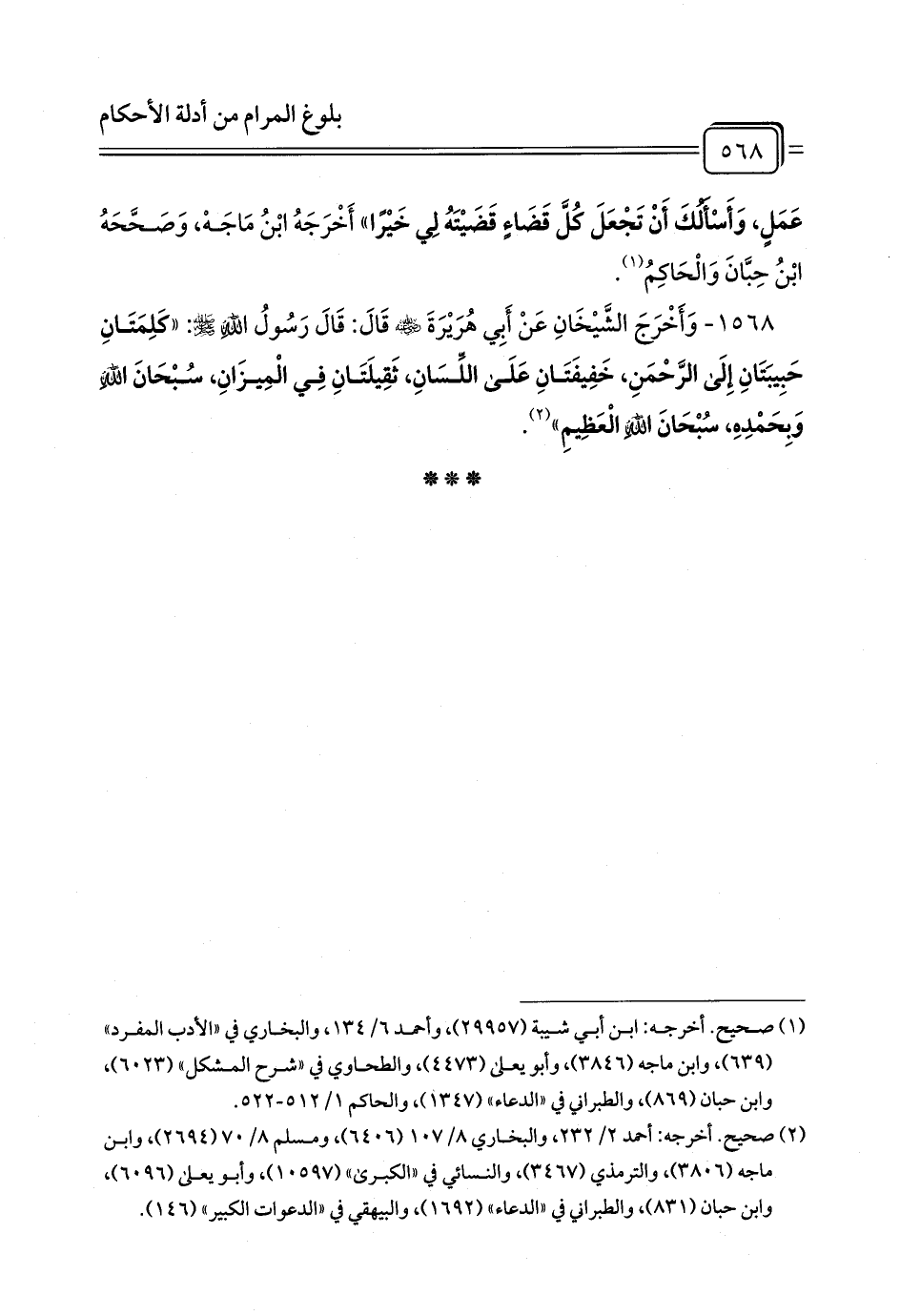 1568 - وَأَخْرَجَ الشَّيْخَانِ عَنْ أَبِي هُرَيْرَةَ - رضي الله عنه - قَالَ: قَالَ رَسُولُ اللَّهِ - صلى الله عليه وسلم -: «كَلِمَتَانِ حَبِيبَتَانِ إِلَى الرَّحْمَنِ، خَفِيفَتَانِ عَلَى اللِّسَانِ، ثَقِيلَتَانِ فِي الْمِيزَانِ، سُبْحَانَ اللَّهِ وَبِحَمْدِهِ، سُبْحَانَ اللَّهِ الْعَظِيمِ» (¬1).