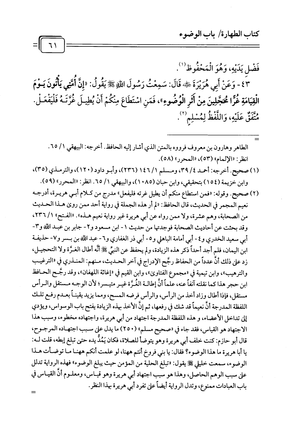 (¬1) صحيح. وقوله: «فمن استطاع منكم أن يطيل غرته فليفعل» مدرج من كلام أبي هريرة، أدرجه نعيم المجمر في الحديث، قال الحافظ: «لم أر هذه الجملة في رواية أحد ممن روى هذا الحديث من الصحابة، وهم عشرة، ولا ممن رواه عن أبي هريرة غير رواية نعيم هذه» .. «الفتح» 1/ 236،