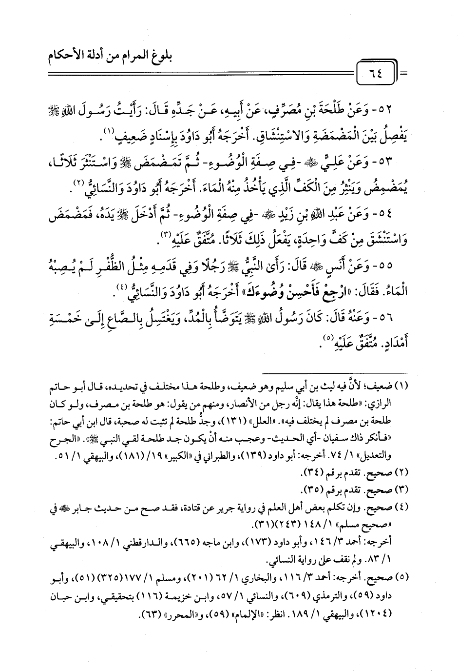 52 - وَعَنْ طَلْحَةَ بْنِ مُصَرِّفٍ، عَنْ أَبِيهِ، عَنْ جَدِّهِ قَالَ: رَأَيْتُ رَسُولَ اللَّهِ - صلى الله عليه وسلم - يَفْصِلُ بَيْنَ الْمَضْمَضَةِ وَالاسْتِنْشَاقِ. أَخْرَجَهُ أَبُو دَاوُدَ بِإِسْنَادٍ ضَعِيفٍ (¬1).
