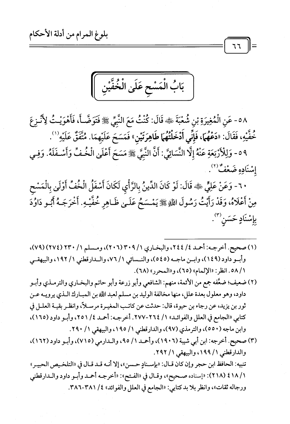 58 - عَنِ الْمُغِيرَةِ بْنِ شُعْبَةَ - رضي الله عنه - قَالَ: كُنْتُ مَعَ النَّبِيِّ - صلى الله عليه وسلم - فَتَوَضَّأَ، فَأَهْوَيْتُ لِأَنْزِعَ خُفَّيْهِ، فَقَالَ: «دَعْهُمَا، فَإِنِّي أَدْخَلْتُهُمَا طَاهِرَتَيْنِ» فَمَسَحَ عَلَيْهِمَا. مُتَّفَقٌ عَلَيْهِ (¬1).