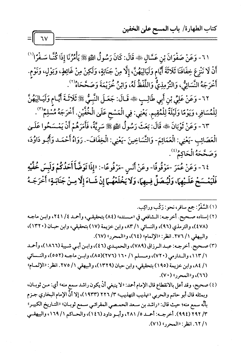 61 - وَعَنْ صَفْوَانَ بْنِ عَسَّالٍ - رضي الله عنه - قَالَ: كَانَ رَسُولُ اللَّهِ - صلى الله عليه وسلم - يَأْمُرُنَا إِذَا كُنَّا سَفْرًا (¬1) أَنْ لَا نَنْزِعَ خِفَافَنَا ثَلَاثَةَ أَيَّامٍ وَلَيَالِيَهُنَّ، إِلَّا مِنْ جَنَابَةٍ، وَلَكِنْ مِنْ غَائِطٍ، وَبَوْلٍ، وَنَوْمٍ. أَخْرَجَهُ النَّسَائِيُّ، وَالتِّرْمِذِيُّ وَاللَّفْظُ لَهُ، وَابْنُ خُزَيْمَةَ وَصَحَّحَاهُ (¬2).