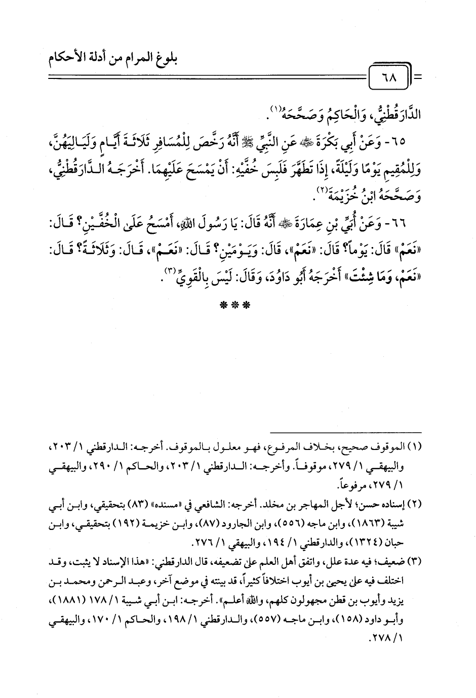65 - وَعَنْ أَبِي بَكْرَةَ - رضي الله عنه - عَنِ النَّبِيِّ - صلى الله عليه وسلم - أَنَّهُ رَخَّصَ لِلْمُسَافِرِ ثَلَاثَةَ أَيَّامٍ وَلَيَالِيَهُنَّ، وَلِلْمُقِيمِ يَوْمًا وَلَيْلَةً، إِذَا تَطَهَّرَ فَلَبِسَ خُفَّيْهِ: أَنْ يَمْسَحَ عَلَيْهِمَا. أَخْرَجَهُ الدَّارَقُطْنِيُّ، وَصَحَّحَهُ ابْنُ خُزَيْمَةَ (¬1).