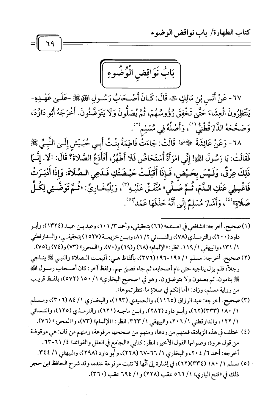 67 - عَنْ أَنَسِ بْنِ مَالِكٍ - رضي الله عنه - قَالَ: كَانَ أَصْحَابُ رَسُولِ اللَّهِ - صلى الله عليه وسلم - عَلَى عَهْدِهِ- يَنْتَظِرُونَ الْعِشَاءَ حَتَّى تَخْفِقَ رُؤُوسُهُمْ، ثُمَّ يُصَلُّونَ وَلَا يَتَوَضَّئُونَ. أَخْرَجَهُ أَبُو دَاوُدَ، وَصَحَّحَهُ الدَّارَقُطْنِيُّ (¬1)، وَأَصْلُهُ فِي مُسْلِمٍ (¬2).