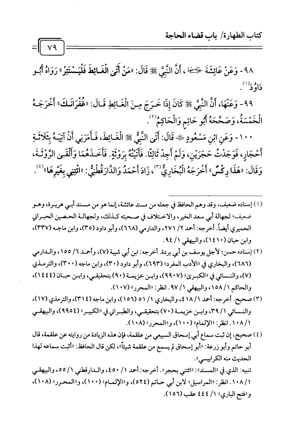 99 - وَعَنْهَا، أَنَّ النَّبِيَّ - صلى الله عليه وسلم - كَانَ إِذَا خَرَجَ مِنَ الْغَائِطِ قَالَ: «غُفْرَانَكَ» أَخْرَجَهُ الْخَمْسَةُ، وَصَحَّحَهُ أَبُو حَاتِمٍ وَالْحَاكِمُ (¬1).