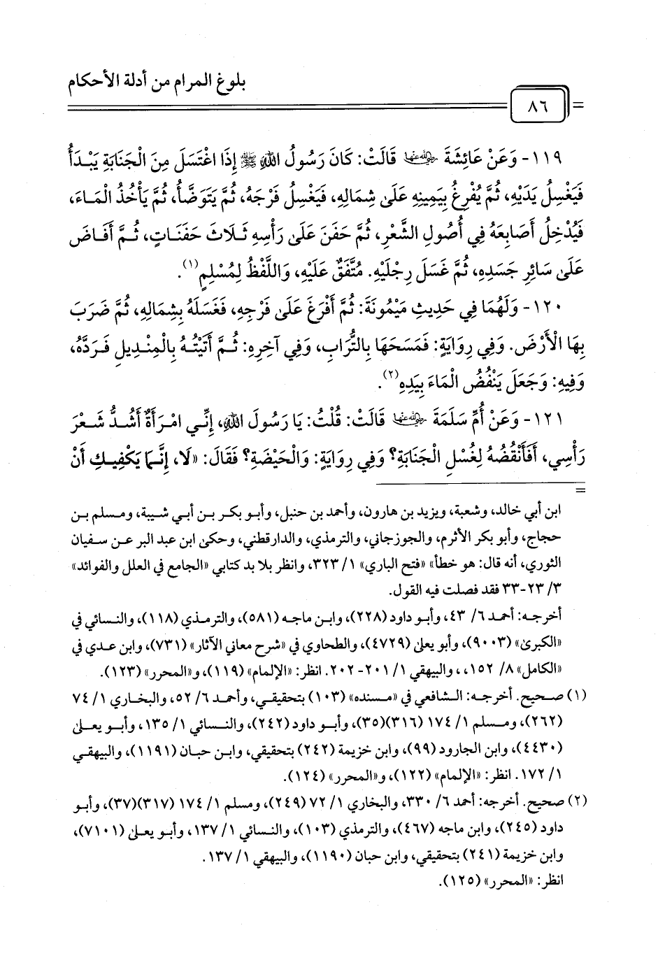 119 - وَعَنْ عَائِشَةَ رَضِيَ اللَّهُ عَنْهَا قَالَتْ: كَانَ رَسُولُ اللَّهِ - صلى الله عليه وسلم - إِذَا اغْتَسَلَ مِنَ الْجَنَابَةِ يَبْدَأُ فَيَغْسِلُ يَدَيْهِ، ثُمَّ يُفْرِغُ بِيَمِينِهِ عَلَى شِمَالِهِ، فَيَغْسِلُ فَرْجَهُ، ثُمَّ يَتَوَضَّأُ، ثُمَّ يَأْخُذُ الْمَاءَ، فَيُدْخِلُ أَصَابِعَهُ فِي أُصُولِ الشَّعْرِ، ثُمَّ حَفَنَ عَلَى رَأْسِهِ ثَلَاثَ حَفَنَاتٍ، ثُمَّ أَفَاضَ عَلَى سَائِرِ جَسَدِهِ، ثُمَّ غَسَلَ رِجْلَيْهِ. مُتَّفَقٌ عَلَيْهِ، وَاللَّفْظُ لِمُسْلِمٍ (¬1).