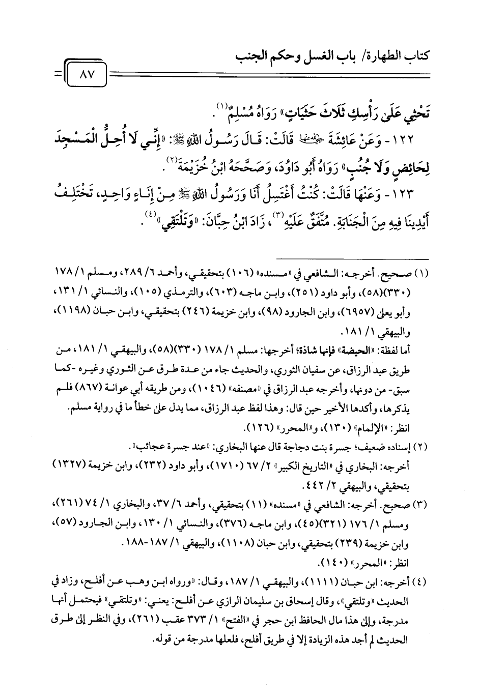122 - وَعَنْ عَائِشَةَ رَضِيَ اللَّهُ عَنْهَا قَالَتْ: قَالَ رَسُولُ اللَّهِ - صلى الله عليه وسلم -: «إِنِّي لَا أُحِلُّ الْمَسْجِدَ لِحَائِضٍ وَلَا جُنُبٍ» رَوَاهُ أَبُو دَاوُدَ، وَصَحَّحَهُ ابْنُ خُزَيْمَةَ (¬1).