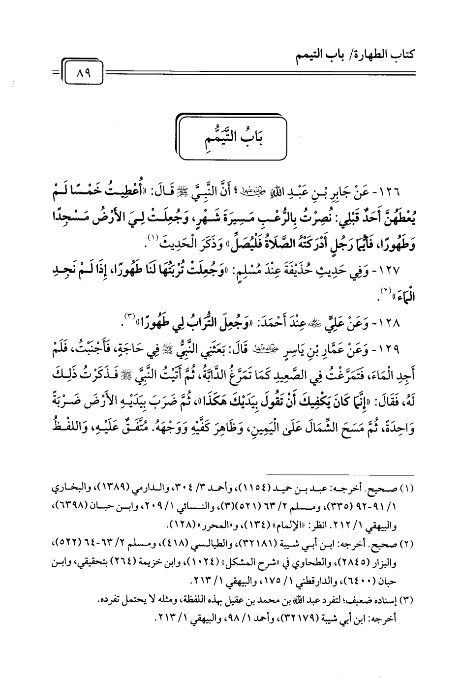 129 - وَعَنْ عَمَّارِ بْنِ يَاسِرٍ رَضِيَ اللَّهُ عَنْهُمَا قَالَ: بَعَثَنِي النَّبِيُّ - صلى الله عليه وسلم - فِي حَاجَةٍ، فَأَجْنَبْتُ، فَلَمْ أَجِدِ الْمَاءَ، فَتَمَرَّغْتُ فِي الصَّعِيدِ كَمَا تَمَرَّغُ الدَّابَّةُ، ثُمَّ أَتَيْتُ النَّبِيَّ - صلى الله عليه وسلم - فَذَكَرْتُ ذَلِكَ لَهُ، فَقَالَ: «إِنَّمَا كَانَ يَكْفِيكَ أَنْ تَقُولَ بِيَدَيْكَ هَكَذَا»، ثُمَّ ضَرَبَ بِيَدَيْهِ الأَرْضَ ضَرْبَةً وَاحِدَةً، ثُمَّ مَسَحَ الشِّمَالَ عَلَى الْيَمِينِ، وَظَاهِرَ كَفَّيْهِ وَوَجْهَهُ. مُتَّفَقٌ عَلَيْهِ، وَاللَّفْظُ