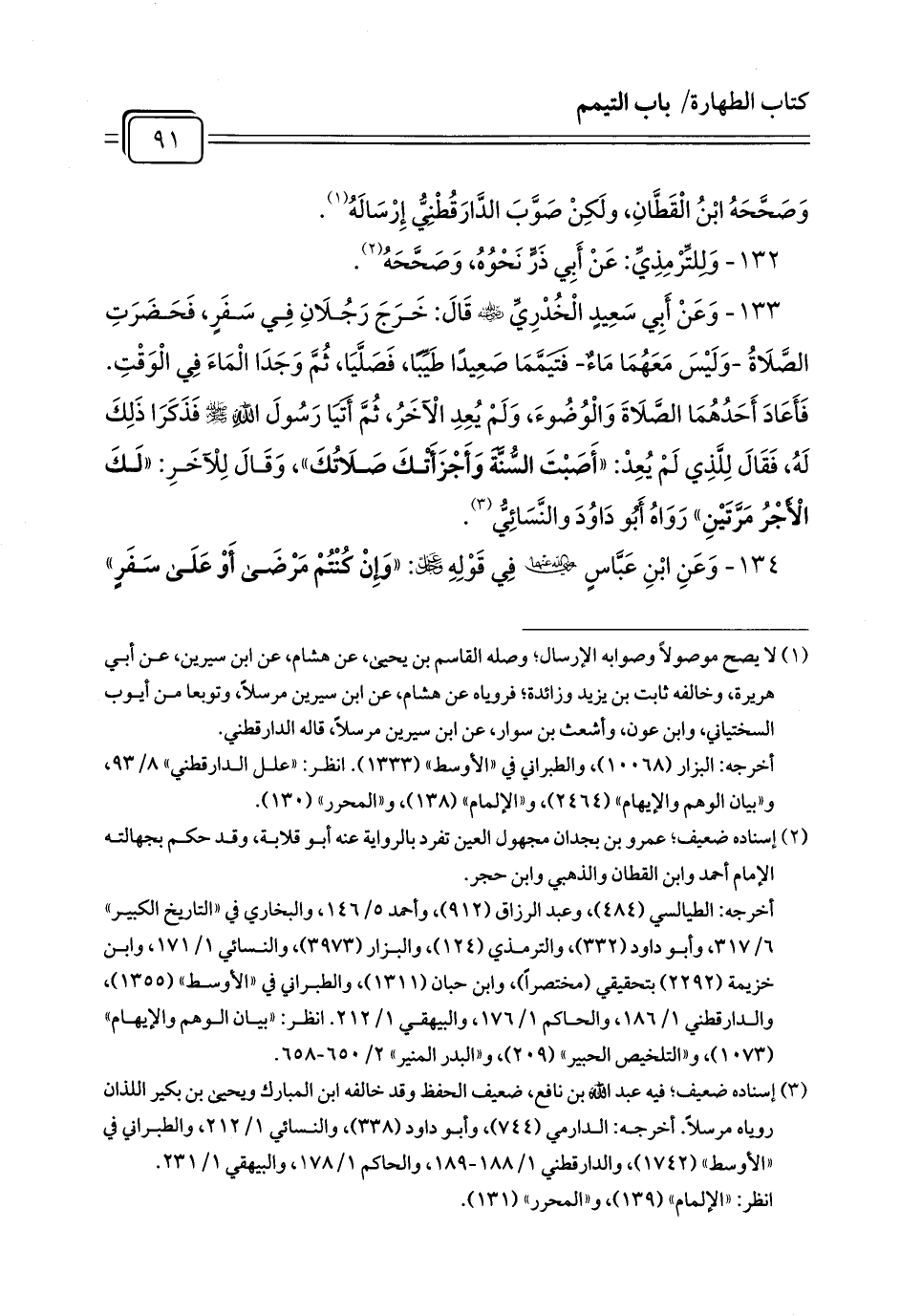 133 - وَعَنْ أَبِي سَعِيدٍ الْخُدْرِيِّ - رضي الله عنه - قَالَ: خَرَجَ رَجُلَانِ فِي سَفَرٍ، فَحَضَرَتِ الصَّلَاةُ -وَلَيْسَ مَعَهُمَا مَاءٌ- فَتَيَمَّمَا صَعِيدًا طَيِّبًا، فَصَلَّيَا، ثُمَّ وَجَدَا الْمَاءَ فِي الْوَقْتِ. فَأَعَادَ أَحَدُهُمَا الصَّلَاةَ وَالْوُضُوءَ، وَلَمْ يُعِدِ الْآخَرُ، ثُمَّ أَتَيَا رَسُولَ اللَّهِ - صلى الله عليه وسلم - فَذَكَرَا ذَلِكَ لَهُ، فَقَالَ لِلَّذِي لَمْ يُعِدْ: «أَصَبْتَ السُّنَّةَ وَأَجْزَأَتْكَ صَلَاتُكَ»، وَقَالَ لِلْآخَرِ: «لَكَ الْأَجْرُ مَرَّتَيْنِ» رَوَاهُ أَبُو دَاوُدَ والنَّسَائِيُّ (¬1).