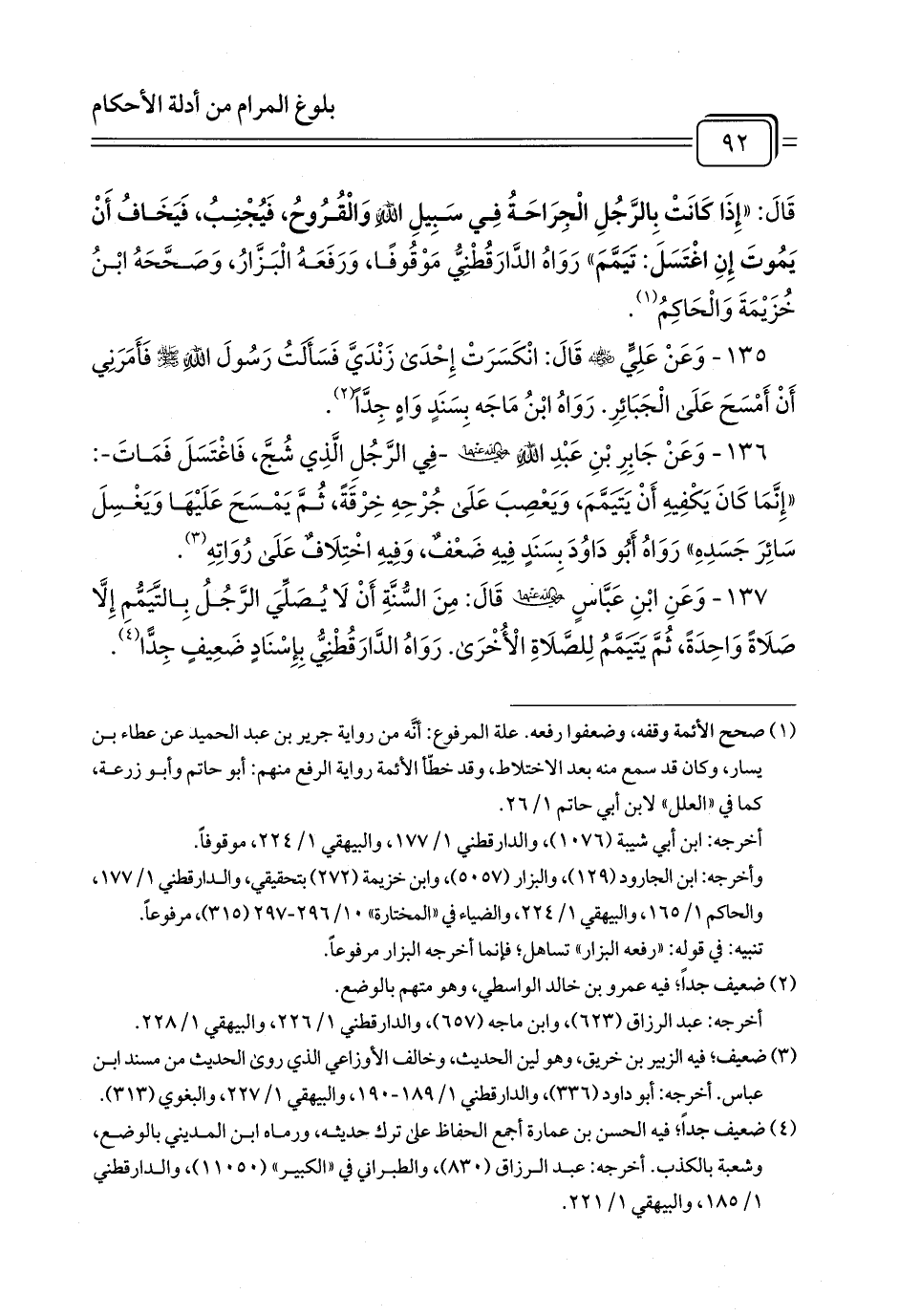 135 - وَعَنْ عَلِيٍّ - رضي الله عنه - قَالَ: انْكَسَرَتْ إِحْدَى زَنْدَيَّ فَسَأَلَتُ رَسُولَ اللَّهِ - صلى الله عليه وسلم - فَأَمَرَنِي أَنْ أَمْسَحَ عَلَى الْجَبَائِرِ. رَوَاهُ ابْنُ مَاجَه بِسَنَدٍ وَاهٍ جِدَّاً (¬1).
