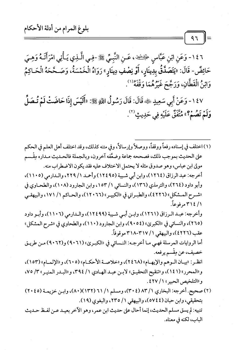 146 - وَعَنِ ابْنِ عَبَّاسٍ رَضِيَ اللَّهُ عَنْهُمَا، عَنِ النَّبِيِّ - صلى الله عليه وسلم - فِي الَّذِي يَأْتِي امْرَأَتَهُ وَهِيَ حَائِضٌ- قَالَ: «يَتَصَدَّقُ بِدِينَارٍ، أَوْ نِصْفِ دِينَارٍ» رَوَاهُ الْخَمْسَةُ، وَصَحَّحَهُ الْحَاكِمُ وَابْنُ الْقَطَّانِ، وَرَجَّحَ غَيْرُهُمَا وَقْفَهُ (¬1).