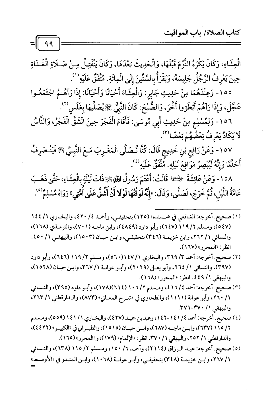 157 - وَعَنْ رَافِعِ بْنِ خَدِيجٍ قَالَ: كُنَّا نُصَلِّي الْمَغْرِبَ مَعَ النَّبِيِّ - صلى الله عليه وسلم - فَيَنْصَرِفُ أَحَدُنَا وَإِنَّهُ لَيُبْصِرُ مَوَاقِعَ نَبْلِهِ. مُتَّفَقٌ عَلَيْهِ (¬1).