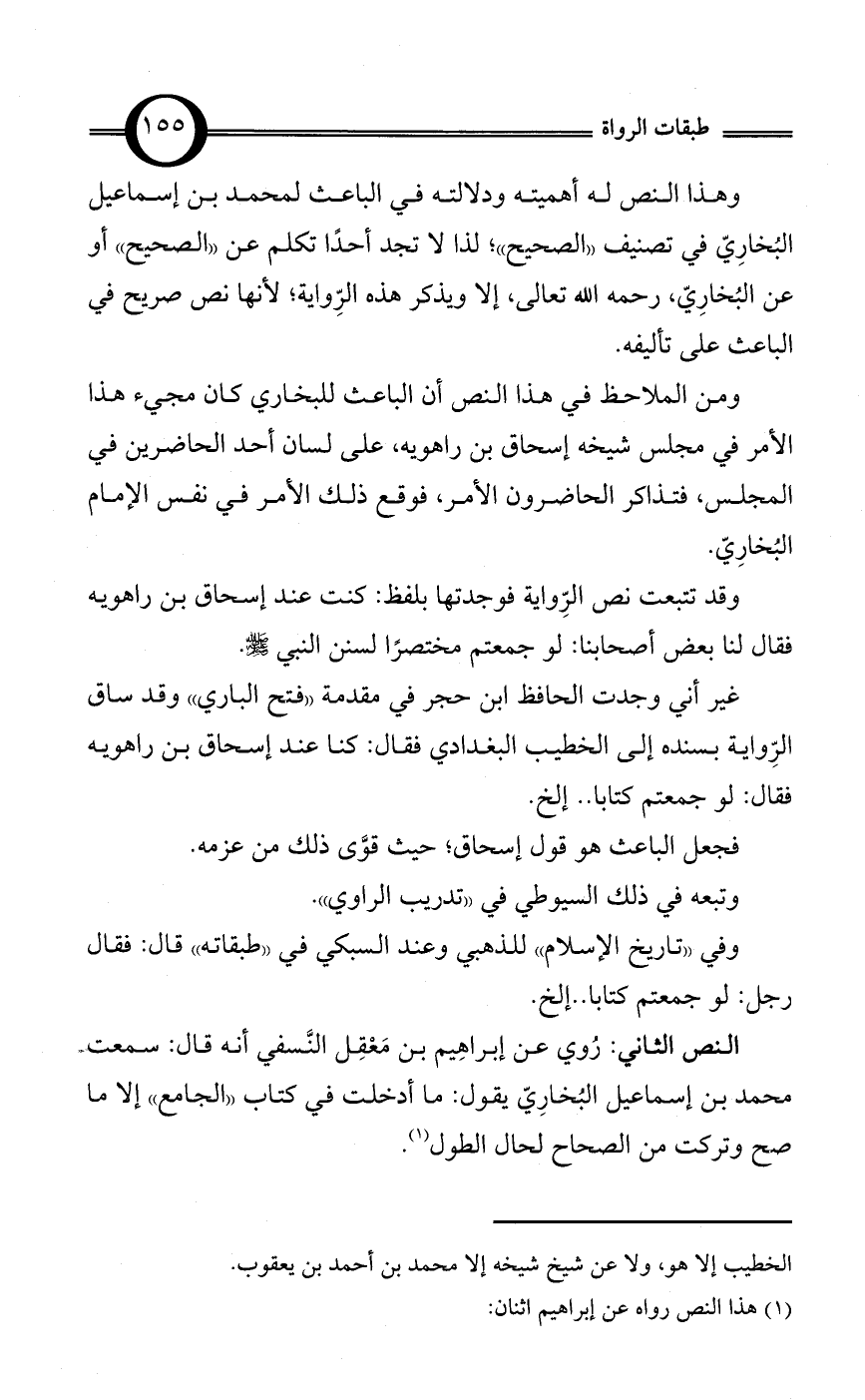 وهذا النص له أهميته ودلالته في الباعث لمحمد بن إسماعيل البُخارِيّ في تصنيف «الصحيح»؛ لذا لا تجد أحدًا تكلم عن «الصحيح» أو عن البُخارِيّ، رحمه الله تعالى، إلا ويذكر هذه الرِّواية؛ لأنها نص صريح في الباعث على تأليفه.