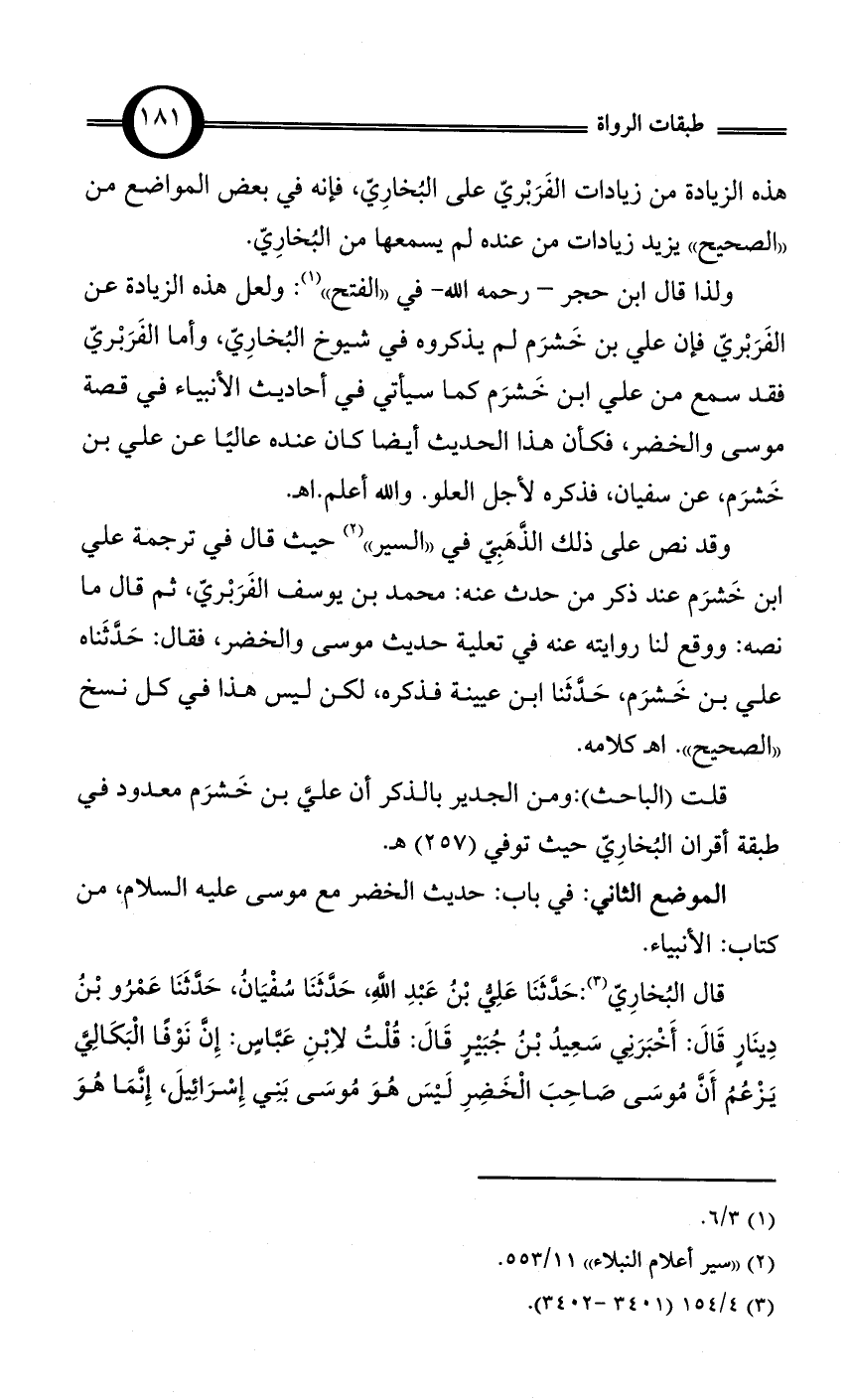 وقد نص على ذلك الذَّهَبِيّ في «السير» (¬2) حيث قال في ترجمة علي بن خَشرَم عند ذكر من حدث عنه: محمد بن يوسف الفَرَبْريّ، ثم قال ما نصه: ووقع لنا روايته عنه في تعلية حديث موسى والخضر، فقال: حَدَّثَناه علي بن خَشرَم، حَدَّثَنا ابن عيينة فذكره، لكن ليس هذا في كل نسخ «الصحيح». اهـ كلامه.