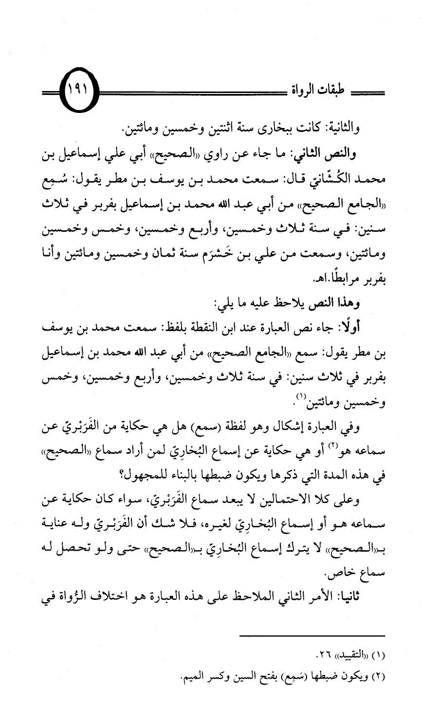 أولًا: جاء نص العبارة عند ابن النقطة بلفظ: سمعت محمد بن يوسف بن مطر يقول: سمع «الجامع الصحيح» من أبي عبد الله محمد بن إسماعيل بفربر في ثلاث سنين: في سنة ثلاث وخمسين، وأربع وخمسين، وخمس وخمسين ومائتين (¬1).