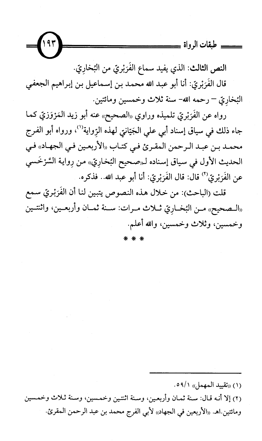 قلت (الباحث): من خلال هذه النصوص يتبين لنا أن الفَرَبْريّ سمع «الصحيح» من البُخارِيّ ثلاث مرات: سنة ثمان وأربعين، واثنتين وخمسين، وثلاث وخمسين، والله أعلم.