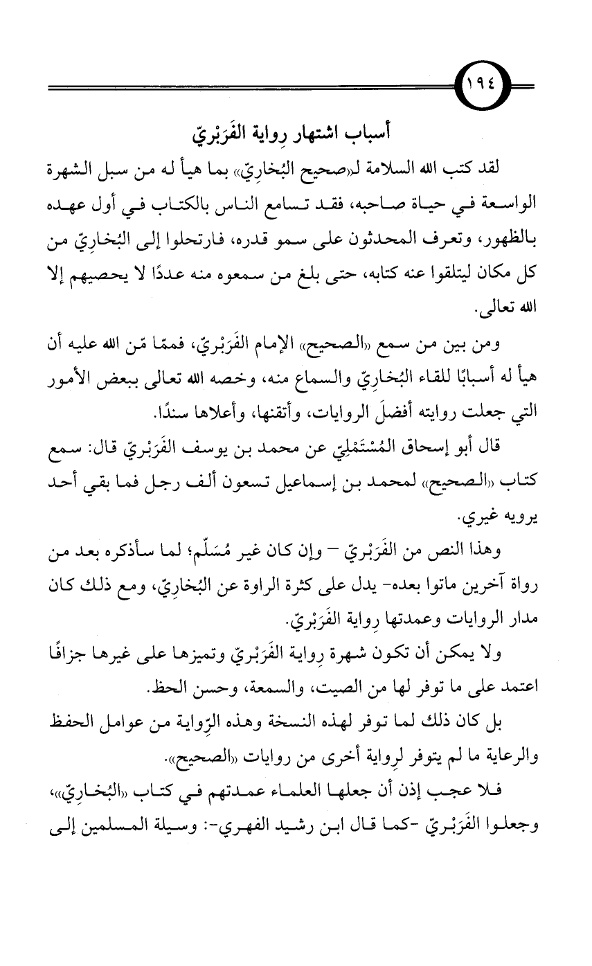 فلا عجب إذن أن جعلها العلماء عمدتهم في كتاب «البُخارِيّ»، وجعلوا الفَرَبْريّ - كما قال ابن رشيد الفهري -: وسيلة المسلمين إلى