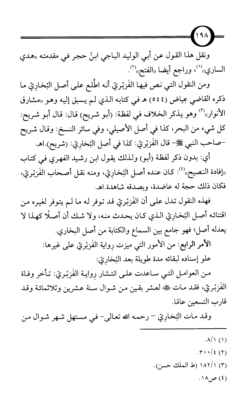 أي: بدون ذكر لفظة (أبو) ولذلك يقول ابن رشيد الفهري في كتاب «إفادة النصيح» (¬4): كان عنده أصل البُخارِيّ، ومنه نقل أصحاب الفَرَبْريّ، فكان ذلك حجة له عاضدة، وبصدقه شاهدة. اهـ.
