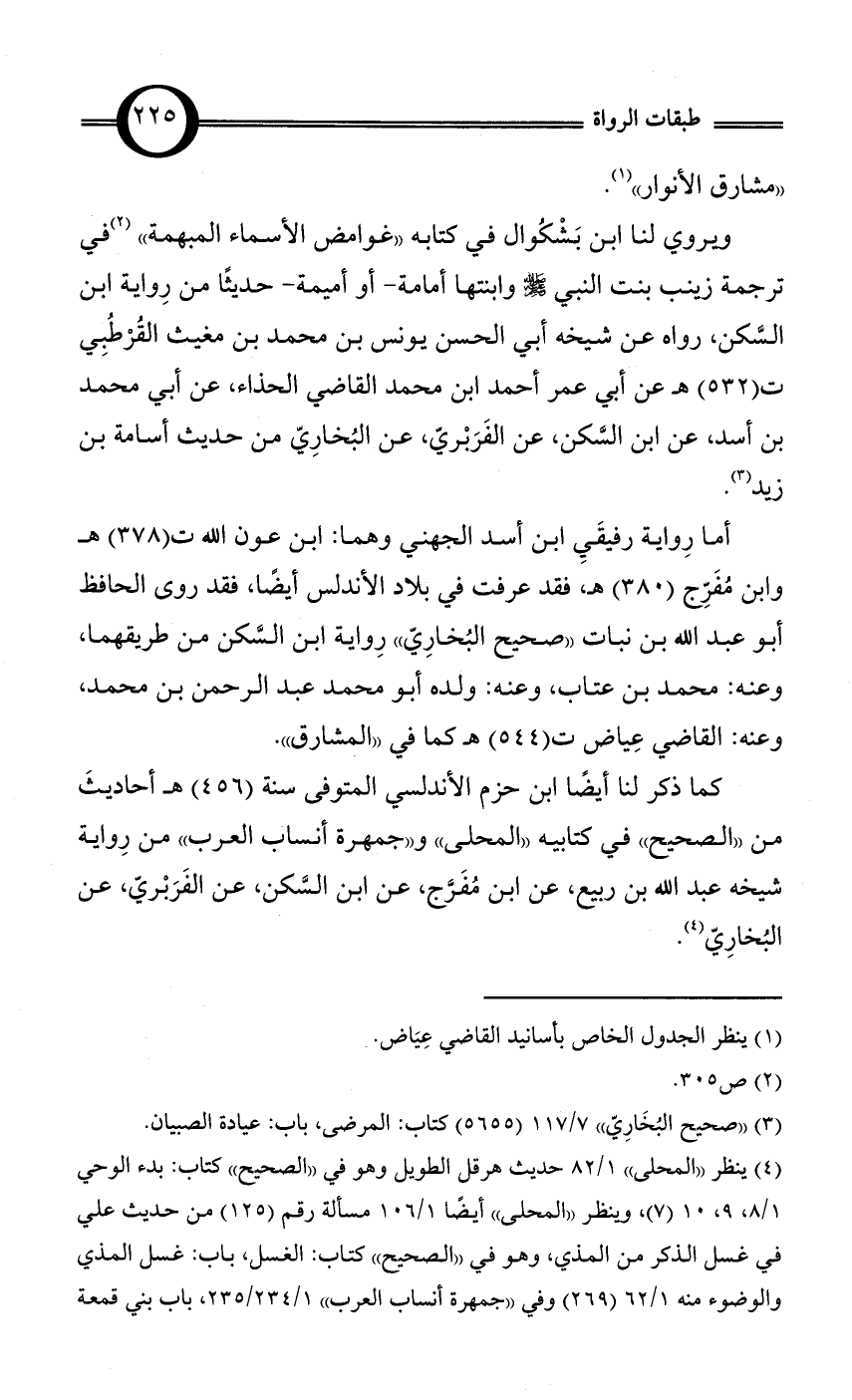 ويروي لنا ابن بَشْكُوال في كتابه «غوامض الأسماء المبهمة» (¬2) في ترجمة زينب بنت النبي - صلى الله عليه وسلم - وابنتها أمامة - أو أميمة - حديثًا من رِواية ابن السَّكن، رواه عن شيخه أبي الحسن يونس بن محمد بن مغيث القُرْطُبِي ت (532) هـ عن أبي عمر أحمد ابن محمد القاضي الحذاء، عن أبي محمد بن أسد، عن ابن السَّكن، عن الفَرَبْريّ، عن البُخارِيّ من حديث أسامة بن زيد (¬3).