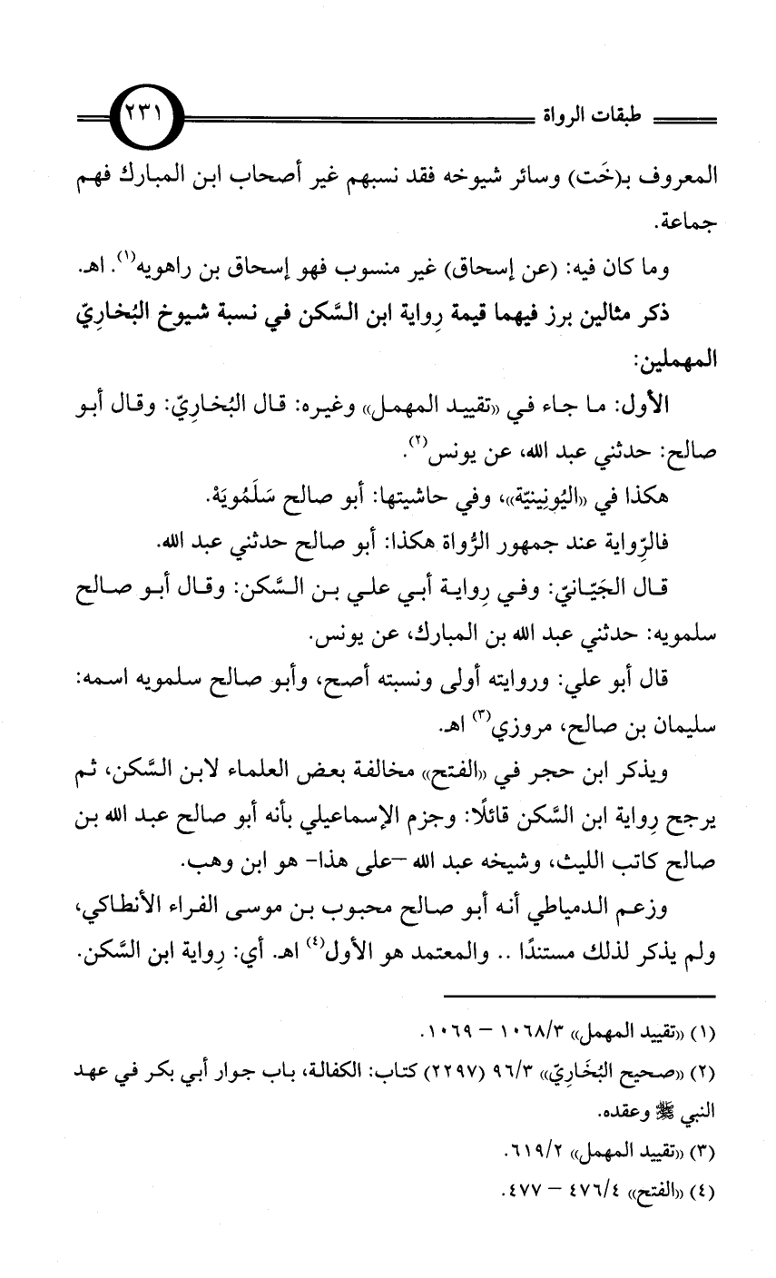 ويذكر ابن حجر في «الفتح» مخالفة بعض العلماء لابن السَّكن، ثم يرجح رِواية ابن السَّكن قائلًا: وجزم الإسماعيلي بأنه أبو صالح عبد الله بن صالح كاتب الليث، وشيخه عبد الله - على هذا - هو ابن وهب.