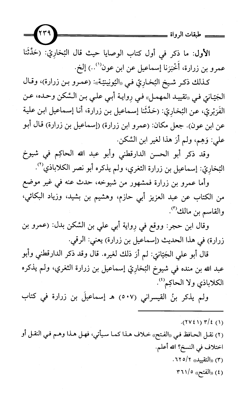 وقد ذكر أبو الحسن الدارقطني وأبو عبد الله الحاكِم في شيوخ البُخارِيّ: إسماعيل بن زرارة الثغري، ولم يذكره أبو نصر الكلاباذي (¬2).