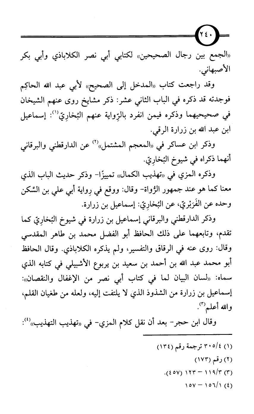 وذكر الدارقطني والبرقاني إسماعيل بن زرارة في شيوخ البُخارِيّ كما تقدم، وتابعهما على ذلك الحافظ أبو الفضل محمد بن طاهر المقدسي وقال: روى عنه في الرقاق والتفسير، ولم يذكره الكلاباذي. وقال الحافظ أبو محمد عبد الله بن أحمد بن سعيد بن يربوع الأشبيلي في كتابه الذي سماه: «لسان البيان لما في كتاب أبي نصر من الإغفال والنقصان»: إسماعيل بن زرارة من الشذوذ الذي لا يلتفت إليه، ولعله من طغيان القلم، والله أعلم (¬3).