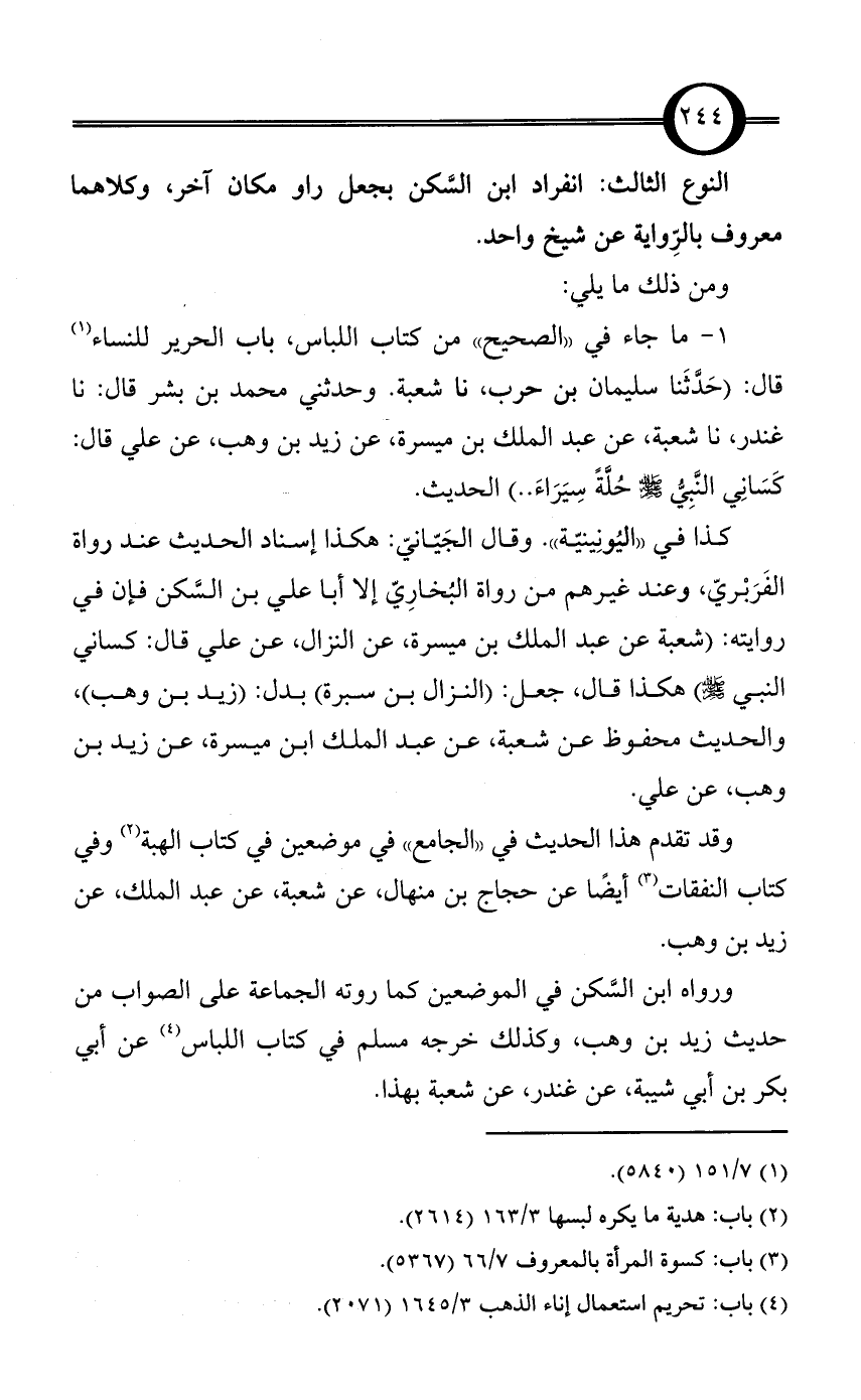 1 - ما جاء في «الصحيح» من كتاب اللباس، باب الحرير للنساء (¬1) قال: (حَدَّثَنا سليمان بن حرب، نا شعبة. وحدثني محمد بن بشر قال: نا غندر، نا شعبة، عن عبد الملك بن ميسرة، عن زيد بن وهب، عن علي قال: كَسَانِي النَّبِيُّ - صلى الله عليه وسلم - حُلَّةً سِيَرَاءَ ...) الحديث.