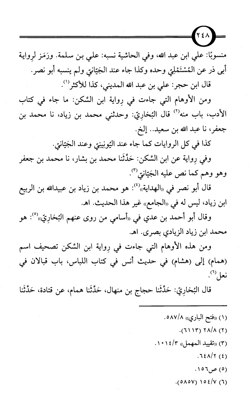 ومن هذه الأوهام التي جاءت في رِواية ابن السَّكن تصحيف اسم (همام) إلى (هشام) في حديث أنس في كتاب اللباس، باب قبالان في نعل (¬6).