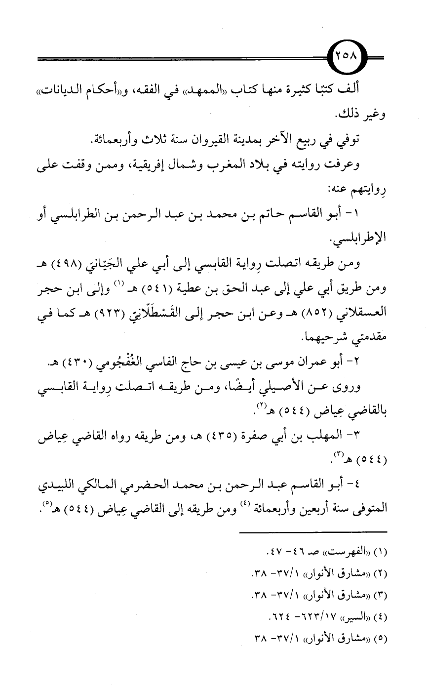 4 - أبو القاسم عبد الرحمن بن محمد الحضرمي المالكي اللبيدي المتوفى سنة أربعين وأربعمائة (¬4) ومن طريقه إلى القاضي عِياض (544) هـ (¬5).