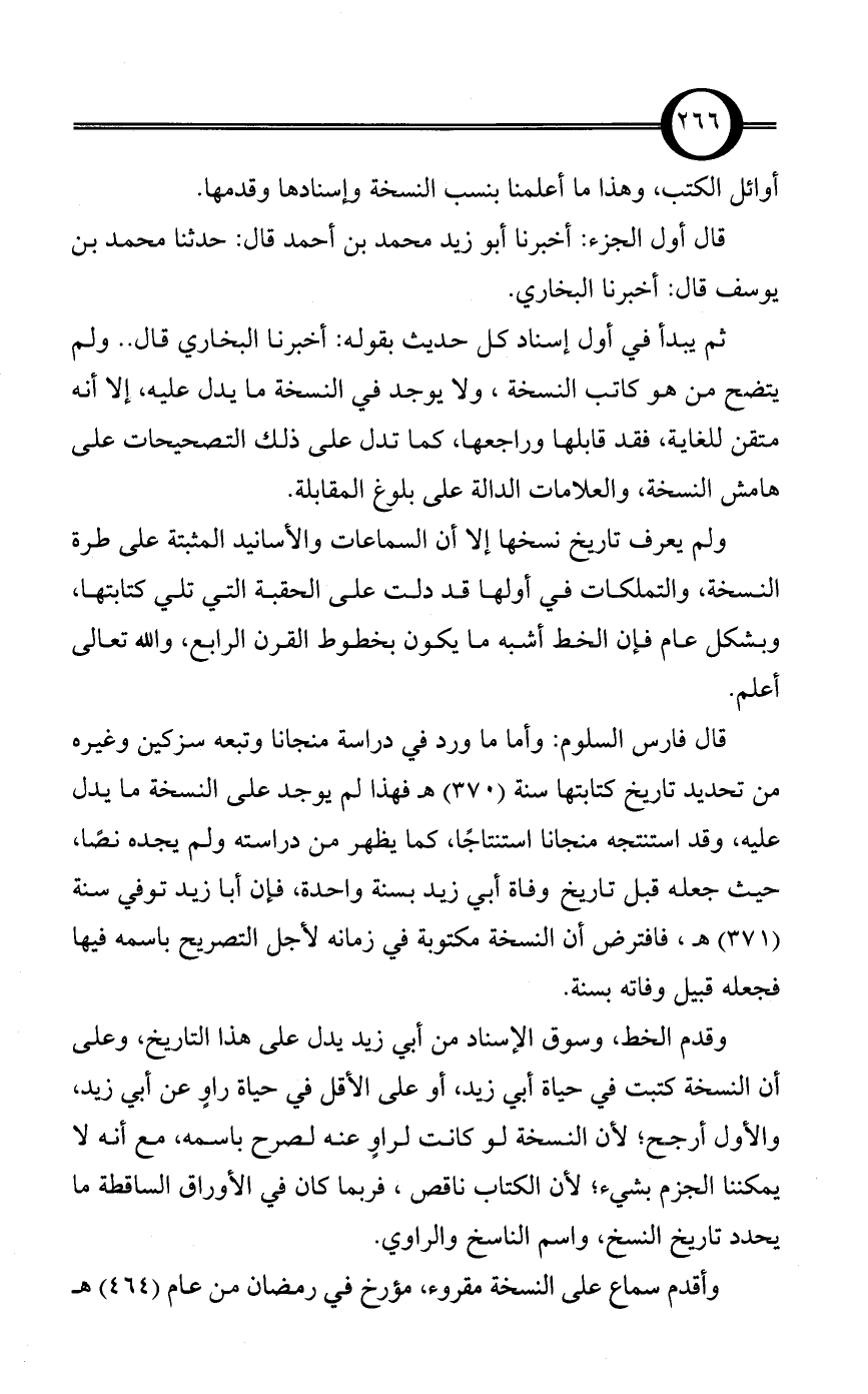 وقدم الخط، وسوق الإسناد من أبي زيد يدل على هذا التاريخ، وعلى أن النسخة كتبت في حياة أبي زيد، أو على الأقل في حياة راوٍ عن أبي زيد، والأول أرجح؛ لأن النسخة لو كانت لراوٍ عنه لصرح باسمه، مع أنه لا يمكننا الجزم بشيء؛ لأن الكتاب ناقص، فربما كان في الأوراق الساقطة ما يحدد تاريخ النسخ، واسم الناسخ والراوي.
