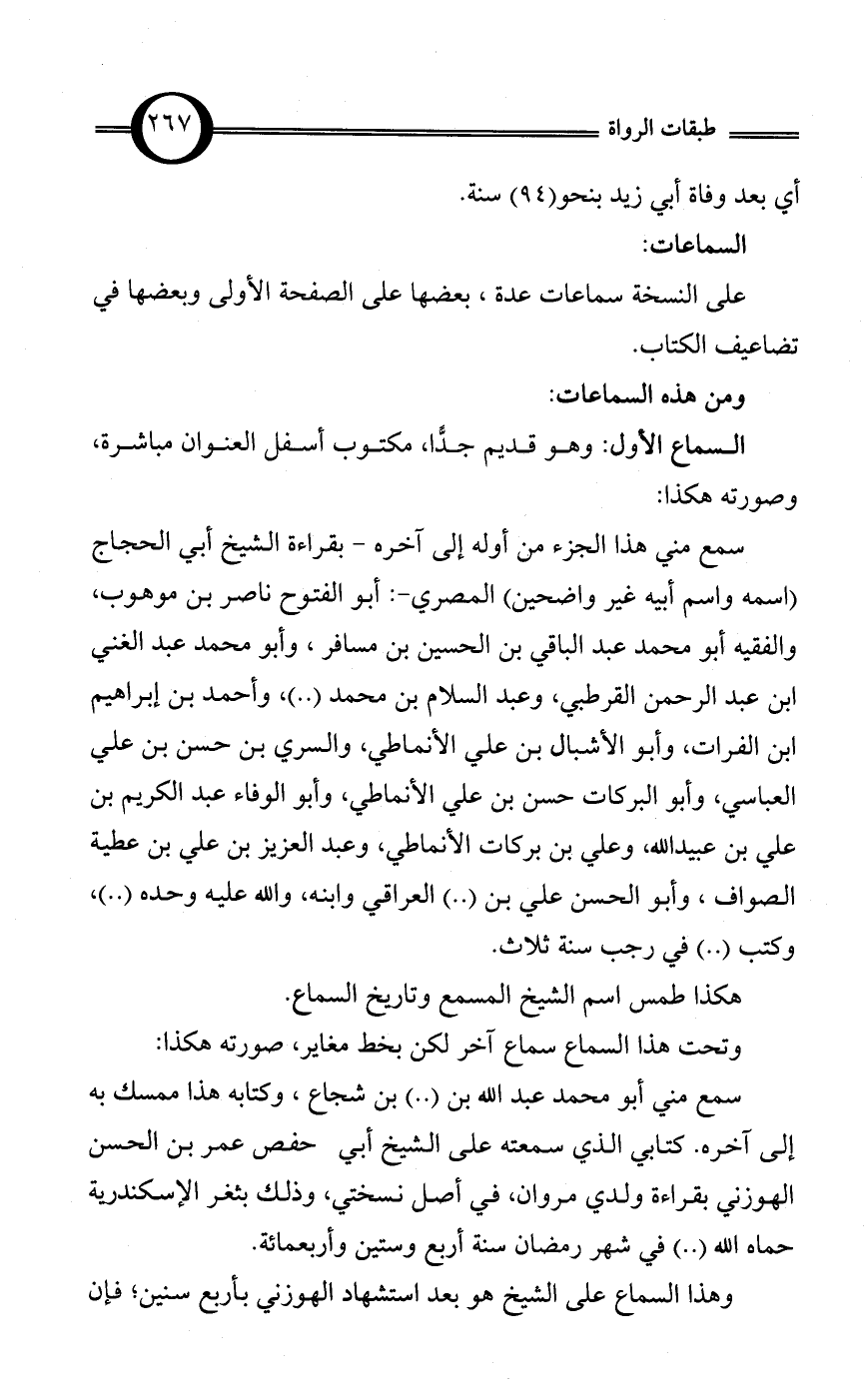 سمع مني أبو محمد عبد الله بن (...) بن شجاع، وكتابه هذا ممسك به إلى آخره. كتابي الذي سمعته على الشيخ أبي حفص عمر بن الحسن الهوزني بقراءة ولدي مروان، في أصل نسختي، وذلك بثغر الإسكندرية حماه الله (...) في شهر رمضان سنة أربع وستين وأربعمائة.
