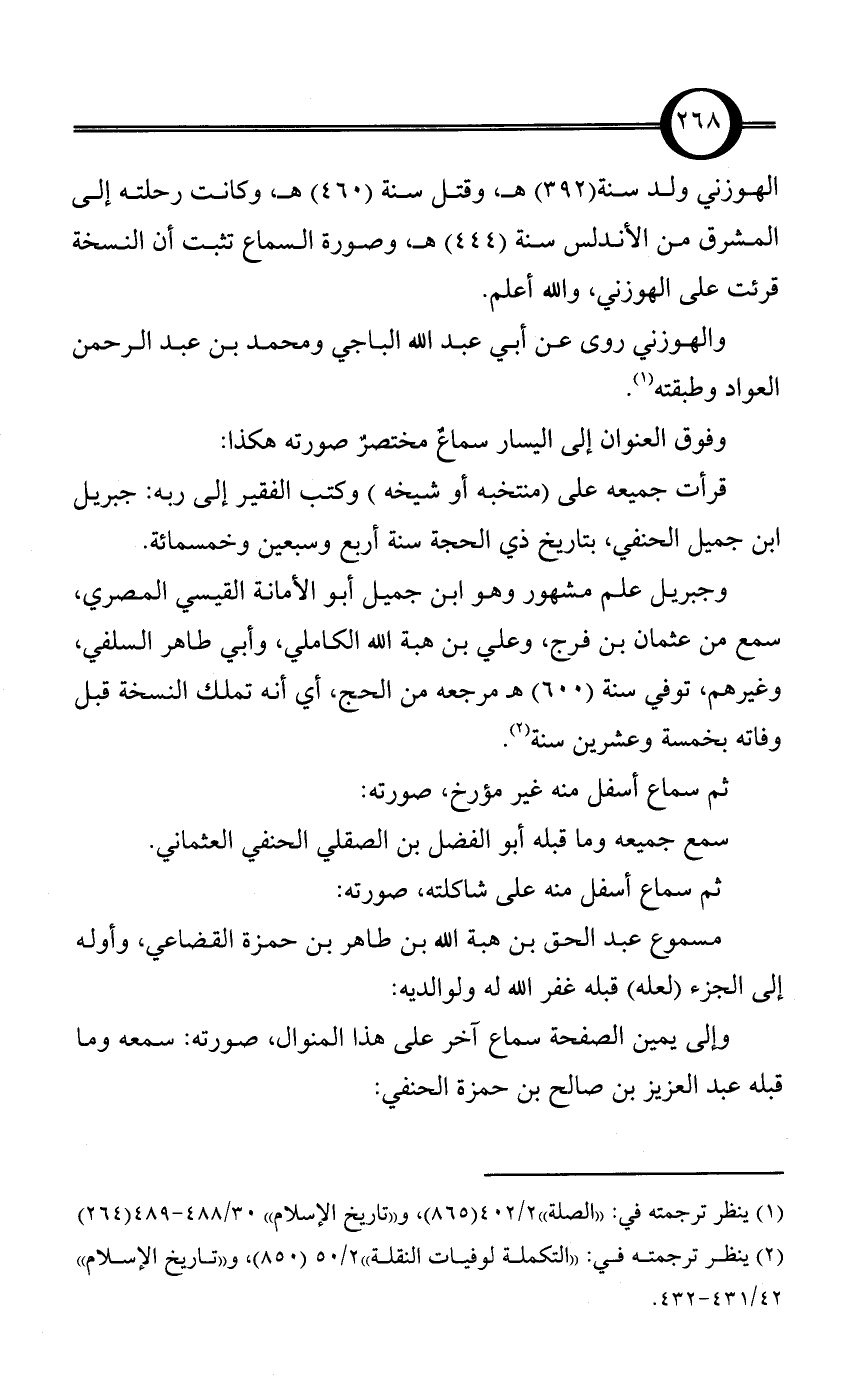 الهوزني ولد سنة (392) هـ، وقتل سنة (460) هـ، وكانت رحلته إلى المشرق من الأندلس سنة (444) هـ، وصورة السماع تثبت أن النسخة قرئت على الهوزني، والله أعلم.