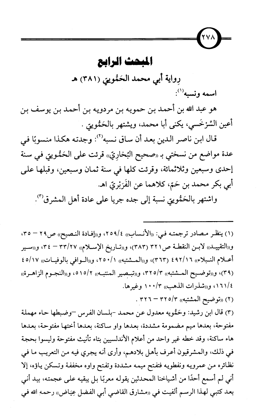 (¬3) قال ابن رشيد: وحَمُّويه معدول عن محمد - بلسان الفرس - وضبطها حاء مهملة مفتوحة، بعدها ميم مضمومة مشددة، بعدها واو ساكنة، بعدها أختها مفتوحة، بعدها هاء ساكنة، وقد خطه غير واحد من أعلام الأندلسيين بتاء تأنيث مفتوحة وليسوا بحجة في ذلك، والمشرقيون أعرف بأهل بلادهم، وأرى أنه يجري فيه من التعريب ما في نظائره من عمرويه ونفطويه فتفتح ميمه مشددة وتفتح واوه مخففة وتسكن ياؤه، إلا أني لم أسمع أحدًا من أشياخنا المحدثين يقوله معربًا بل يبقيه على عجمته، بيد أني بعد كتبي لهذا الرسم ألفيت في «مشارق القاضي أبي الفضل عِيَاض» رحمه الله في اسم الحموي: والعجم يقولون كل هذا بضم ما قبل الواو، مثل علُّويه وحمُّويه، والعرب بفتح الواو فنقول: علَّوَيه وحَمَّويه وسيَبَويه ونفطويه «إفادة النصيح» ص: 29، وينظر «مشارق الأنوار» 1/ 227.