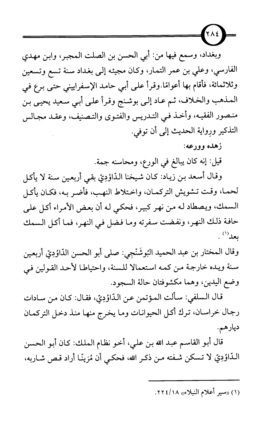 وقال أسعد بن زياد: كان شيخنا الدّاوُدِيّ بقي أربعين سنة لا يأكل لحما، وقت تشويش التركمان، واختلاط النهب، فأضر به، فكان يأكل السمك، ويصطاد له من نهر كبير، فحكي له أن بعض الأمراء أكل على حافة ذلك النهر، ونفضت سفرته وما فضل في النهر، فما أكل السمك بعد (¬1).وقال المختار بن عبد الحميد البُوشَنْجِي: صلى أبو الحسن الدّاوُدِيّ أربعين سنة ويده خارجة من كمه استعمالا للسنة، واحتياطا لأحد القولين في وضع اليدين، وهما مكشوفتان حالة السجود.