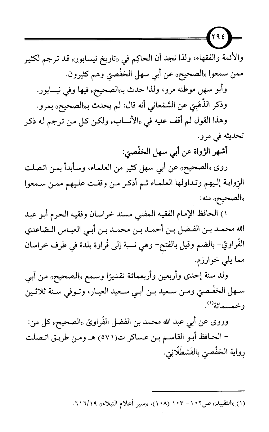 والأئمة والفقهاء، ولذا نجد أن الحاكِم في «تاريخ نيسابور» قد ترجم لكثير ممن سمعوا «الصحيح» عن أبي سهل الحَفْصيّ وهم كثيرون.