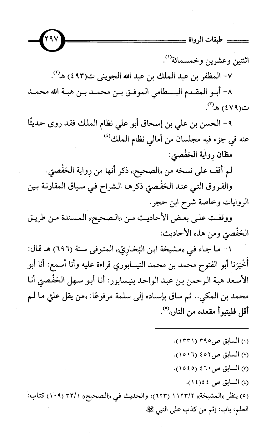 ووقفت على بعض الأحاديث من «الصحيح» المسندة من طريق الحَفْصيّ ومن هذه الأحاديث: