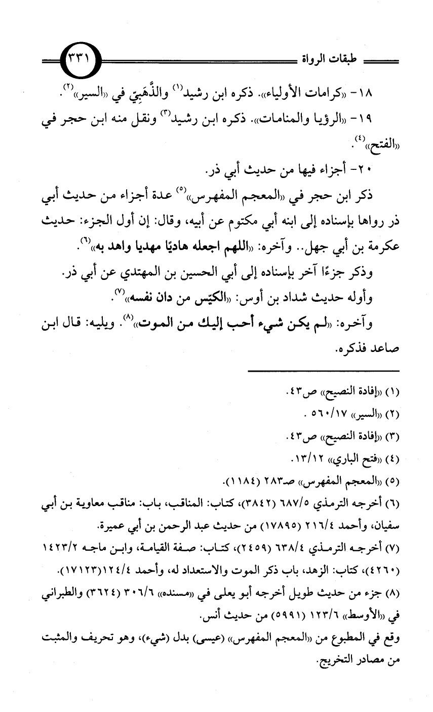 18 - «كرامات الأولياء». ذكره ابن رشيد (¬1) والذَّهَبِيّ في «السير» (¬2).