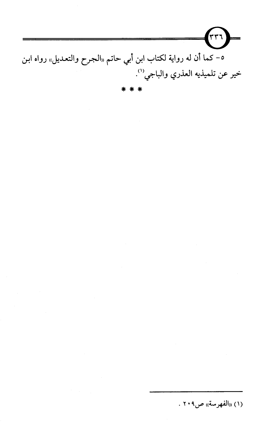 5 - كما أن له رواية لكتاب ابن أبي حاتم «الجرح والتعديل» رواه ابن خير عن تلميذيه العذري والباجي (¬1).