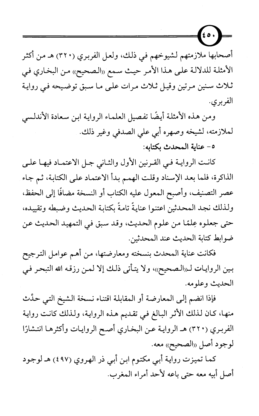 أصحابها ملازمتهم لشيوخهم في ذلك، ولعل الفربري (320) هـ من أكثر الأمثلة للدلالة على هذا الأمر حيث سمع «الصحيح» من البخاري في ثلاث سنين مرتين وقيل ثلاث مرات على ما سبق توضيحه في رواية الفربري.