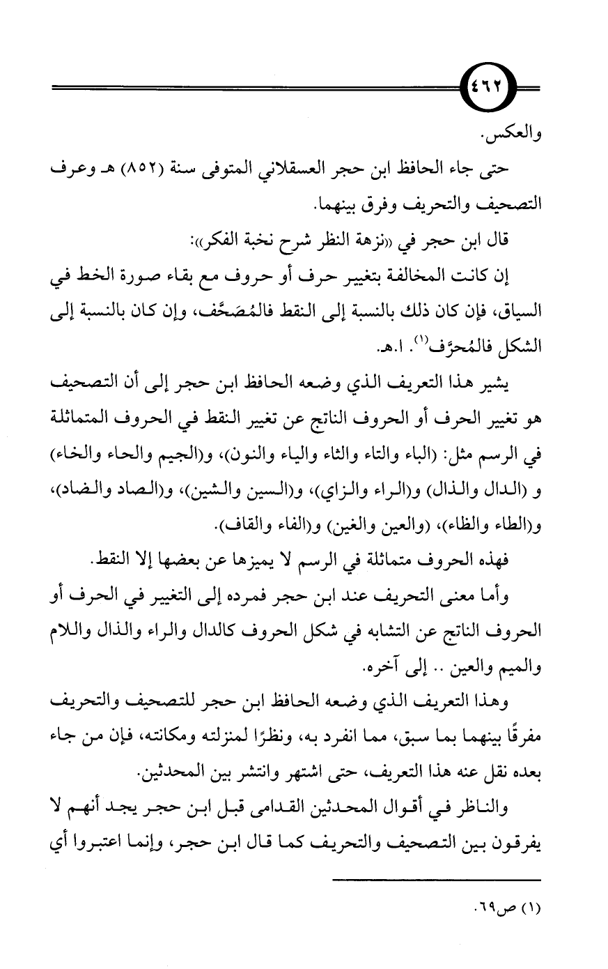 حتى جاء الحافظ ابن حجر العسقلاني المتوفى سنة (852) هـ وعرف التصحيف والتحريف وفرق بينهما.