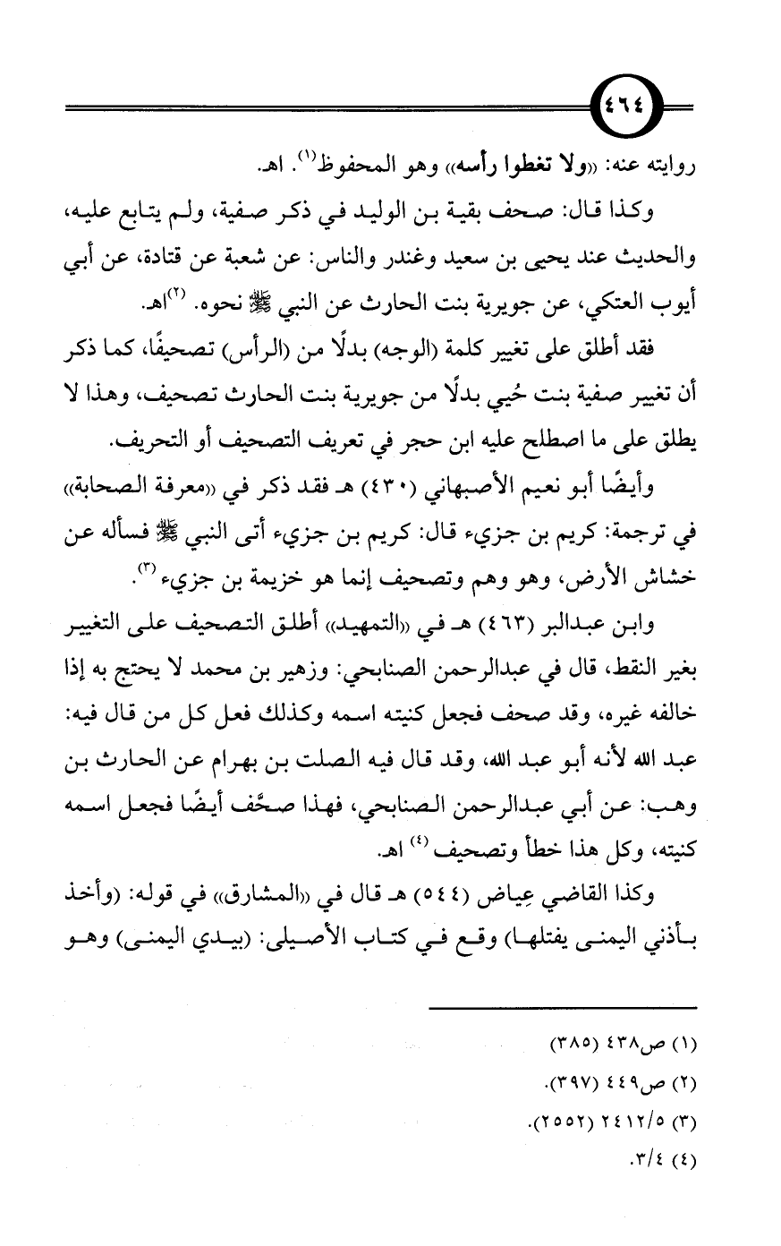 وابن عبد البر (463) هـ في «التمهيد» أطلق التصحيف على التغيير بغير النقط، قال في عبد الرحمن الصنابحي: وزهير بن محمد لا يحتج به إذا خالفه غيره، وقد صحف فجعل كنيته اسمه وكذلك فعل كل من قال فيه: عبد الله لأنه أبو عبد الله، وقد قال فيه الصلت بن بهرام عن الحارث بن وهب: عن أبي عبد الرحمن الصنابحي، فهذا صحَّف أيضًا فجعل اسمه كنيته، وكل هذا خطأ وتصحيف (¬4) اهـ.