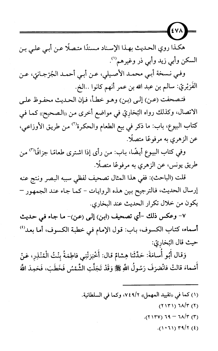 قلت (الباحث): ففي هذا المثال تصحيف لفظي سببه البصر ونتج عنه إرسال الحديث، فالترجيح بين هذه الروايات - كما جاء عند الجمهور - يكون من خلال تكرار الحديث عند البخاري.