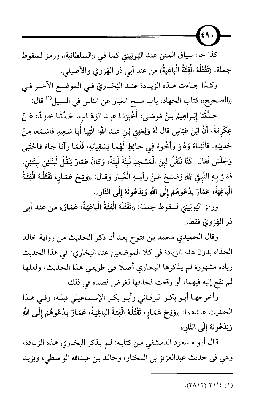 كذا جاء سياق المتن عند اليُونِينِيّ كما في «السلطانية» ورمز لسقوط جملة: (تَقْتُلُهُ الْفِئَةُ الْباغِيَةُ) من عند أبي ذر الهَرَويّ والأصيلي.