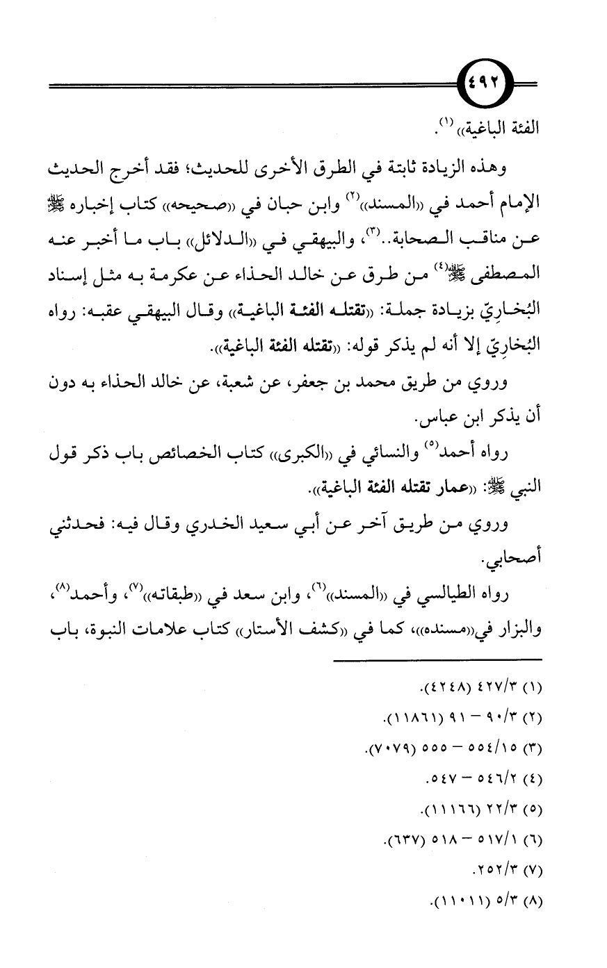 وهذه الزيادة ثابتة في الطرق الأخرى للحديث؛ فقد أخرج الحديث الإمام أحمد في «المسند» (¬2) وابن حبان في «صحيحه» كتاب إخباره - صلى الله عليه وسلم - عن مناقب الصحابة .. (¬3)، والبيهقي في «الدلائل» باب ما أخبر عنه المصطفى - صلى الله عليه وسلم - (¬4) من طرق عن خالد الحذاء عن عكرمة به مثل إسناد البُخارِيّ بزيادة جملة: «تقتله الفئة الباغية» وقال البيهقي عقبه: رواه البُخارِيّ إلا أنه لم يذكر قوله: «تقتله الفئة الباغية».
