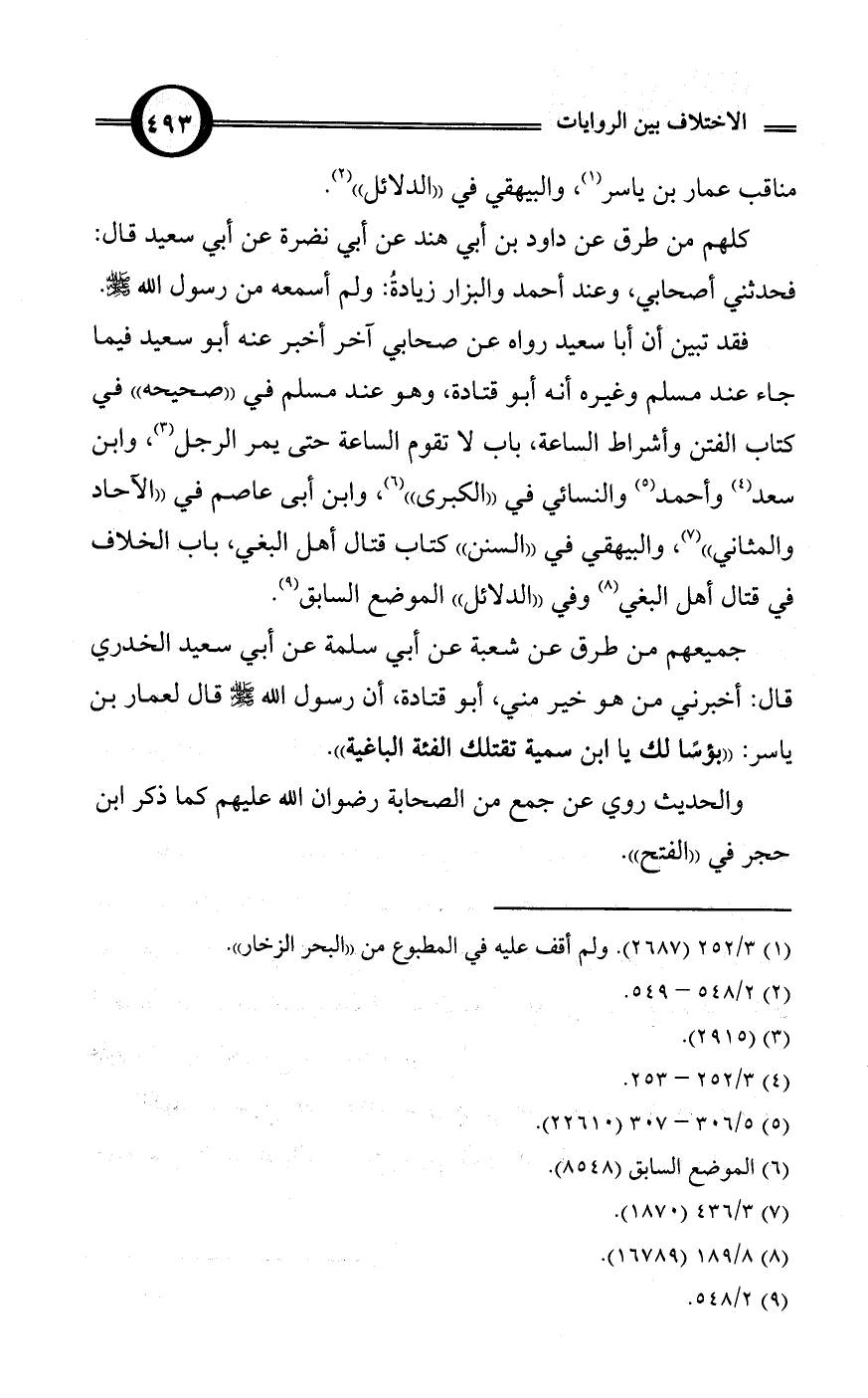فقد تبين أن أبا سعيد رواه عن صحابي آخر أخبر عنه أبو سعيد فيما جاء عند مسلم وغيره أنه أبو قتادة، وهو عند مسلم في «صحيحه» في كتاب الفتن وأشراط الساعة، باب لا تقوم الساعة حتى يمر الرجل (¬3)، وابن سعد (¬4) وأحمد (¬5) والنسائي في «الكبرى» (¬6)، وابن أبى عاصم في «الآحاد والمثاني» (¬7)، والبيهقي في «السنن» كتاب قتال أهل البغي، باب الخلاف في قتال أهل البغي (¬8) وفي «الدلائل» الموضع السابق (¬9).