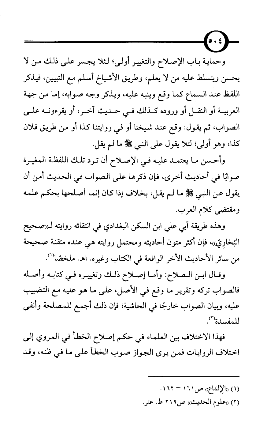 وقال ابن الصلاح: وأما إصلاح ذلك وتغييره في كتابه وأصله فالصواب تركه وتقرير ما وقع في الأصل، على ما هو عليه مع التضبيب عليه، وبيان الصواب خارجًا في الحاشية؛ فإن ذلك أجمع للمصلحة وأنفى للمفسدة (¬2).