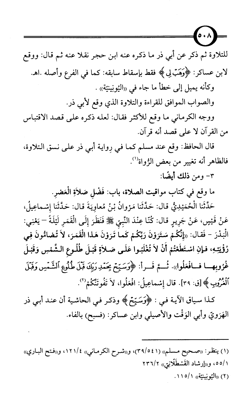حَدَّثَنا الْحُمَيْدِيُّ قال: حَدَّثَنا مَرْوانُ بْنُ مُعاوِيَةَ قال: حَدَّثَنا إِسْماعِيلُ، عَنْ قَيْسٍ، عَنْ جَرِيرٍ قال: كُنّا عِنْدَ النَّبِيِّ - صلى الله عليه وسلم - فَنَظَرَ إِلَى الْقَمَرِ لَيْلَةً - يَعْنِي: الْبَدْرَ - فَقال: «إِنَّكُمْ سَتَرَوْنَ رَبَّكُمْ كَما تَرَوْنَ هَذا الْقَمَرَ، لاَ تُضامُّونَ فِي رُؤْيَتِهِ، فإنِ اسْتَطَعْتُمْ أَنْ لاَ تُغْلَبُوا عَلَى صَلاَةٍ قَبْلَ طُلُوعِ الشَّمْسِ وَقَبْلَ غُرُوبِها فافْعَلُوا». ثُمَّ قَرأ: {وَسَبِّحْ بِحَمْدِ رَبِّكَ قَبْلَ طُلُوعِ الشَّمْسِ وَقَبْلَ الْغُرُوبِ} [ق: 39]. قال إِسْماعِيلُ: افْعَلُوا، لاَ تَفُوتَنَّكُمْ (¬2).