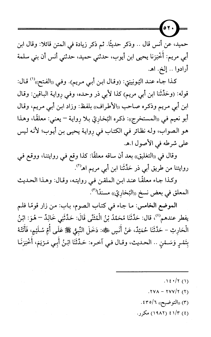 حميد، عن أنس قال .. وذكر حديثًا. ثم ذكر زيادة في المتن قائلا: وقال ابن أبي مريم: أَخْبَرَنا يحيى ابن أيوب، حدثني حميد، حدثني أنس أن بني سلمة أرادوا ... إلخ. اهـ.