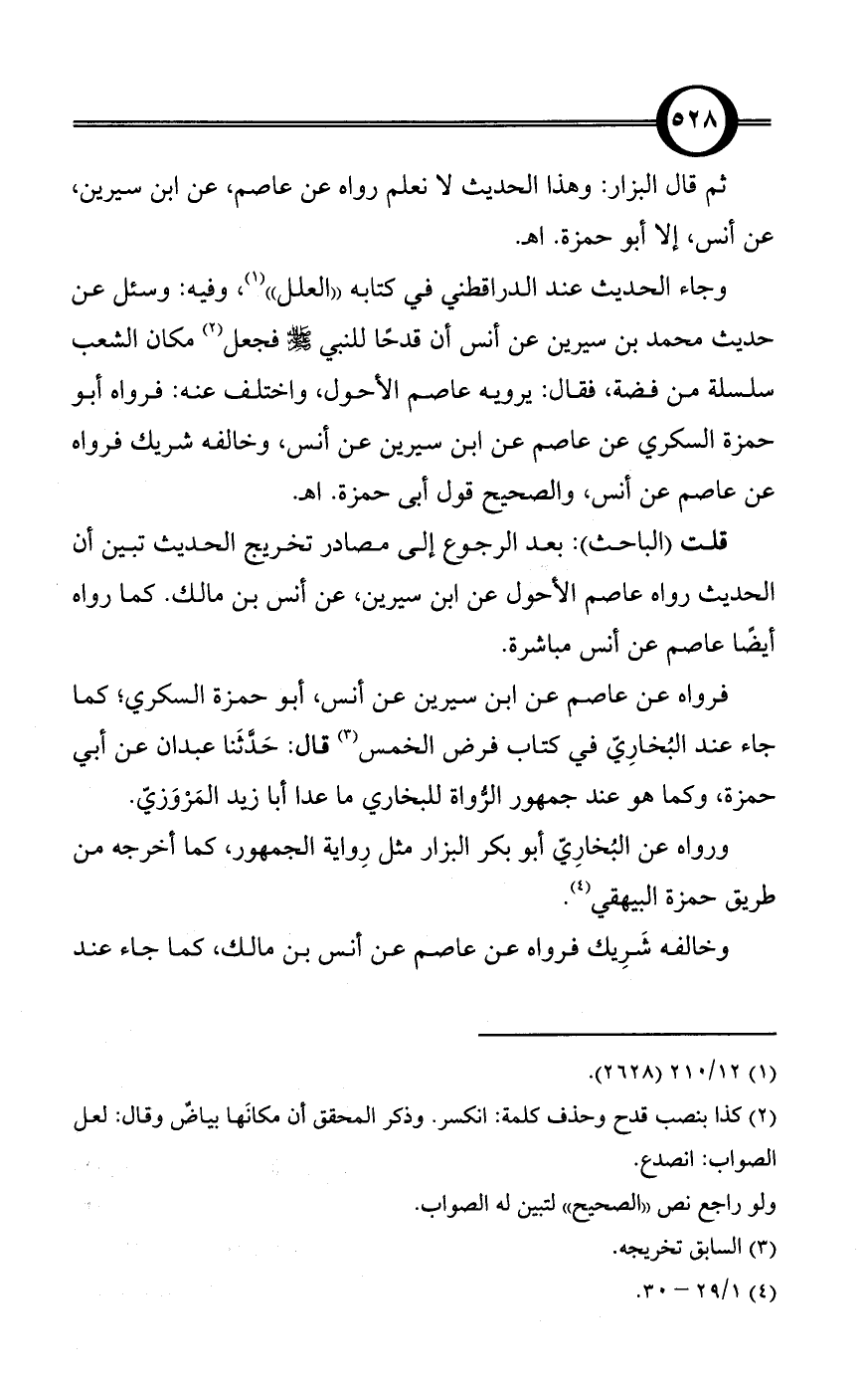 قلت (الباحث): بعد الرجوع إلى مصادر تخريج الحديث تبين أن الحديث رواه عاصم الأحول عن ابن سيرين، عن أنس بن مالك. كما رواه أيضًا عاصم عن أنس مباشرة.